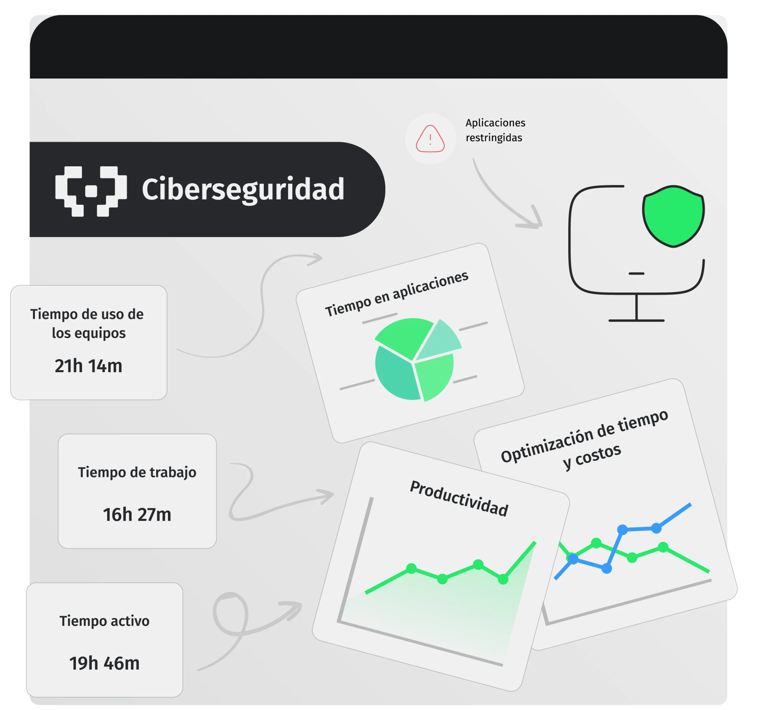 Se compone de un aplicativo web en el que se configuran las políticas de seguridad y se accede a informes y análisis y un driver de escritorio que recopila los datos de ciberseguridad y productividad. Ambos se soportan y comunican utilizando la infrestructura y servicios de GCP (Google Cloud Platform) para almacenar y procesar la información recopilada.